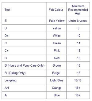The Pony Club Training structure encourages members to take tests throughout their Pony Club career enabling them to learn progressively about horse and pony care and riding. The tests are normally taken at recommended ages and are designed with certain criteria. Each test is awarded a different colour felt to be placed under their Pony Club badge.